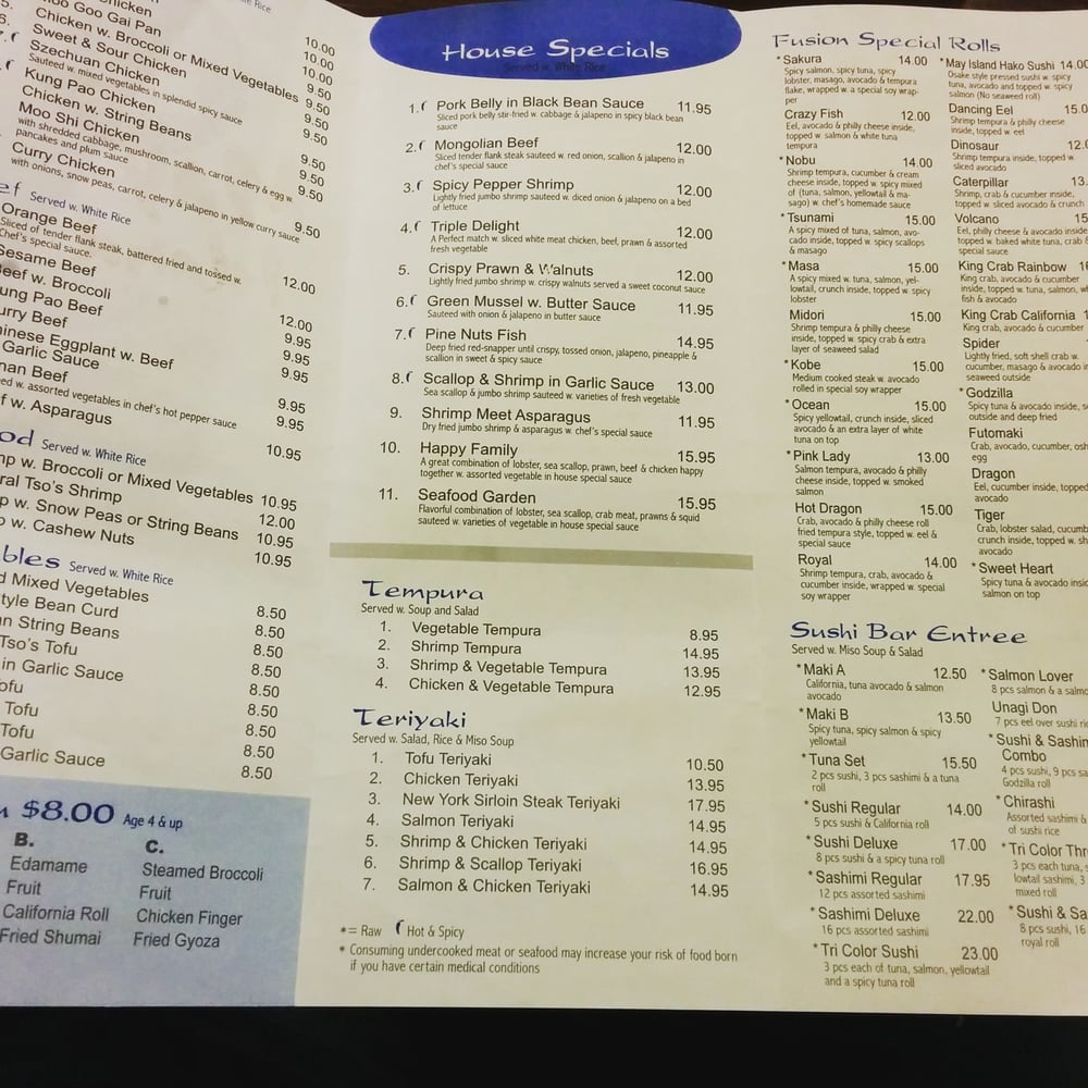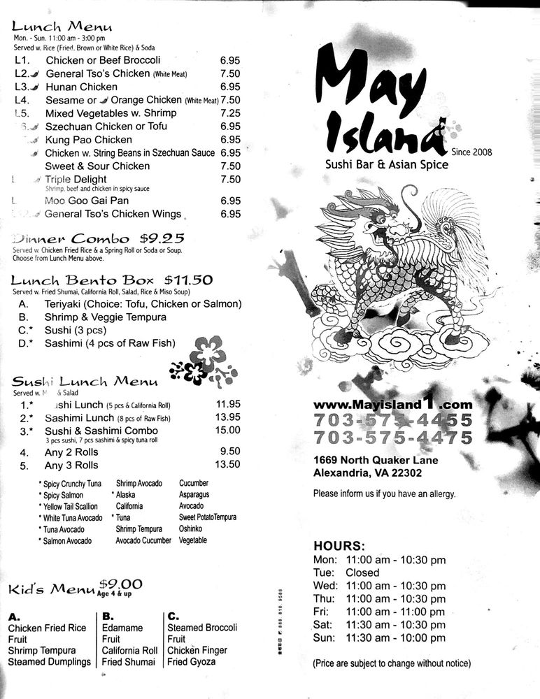 Welcome to May Island Restaurant, a hidden gem in Alexandria, VA, where Japanese and Chinese cuisines beautifully converge. This casual eatery is renowned for its extensive menu, offering a delightful range of vegetarian options, sushi rolls, and hearty chicken dishes. The Oshinko Roll, alongside the creamy AVC Roll and Sweet Potato Tempura Roll, promises to enchant your taste buds.